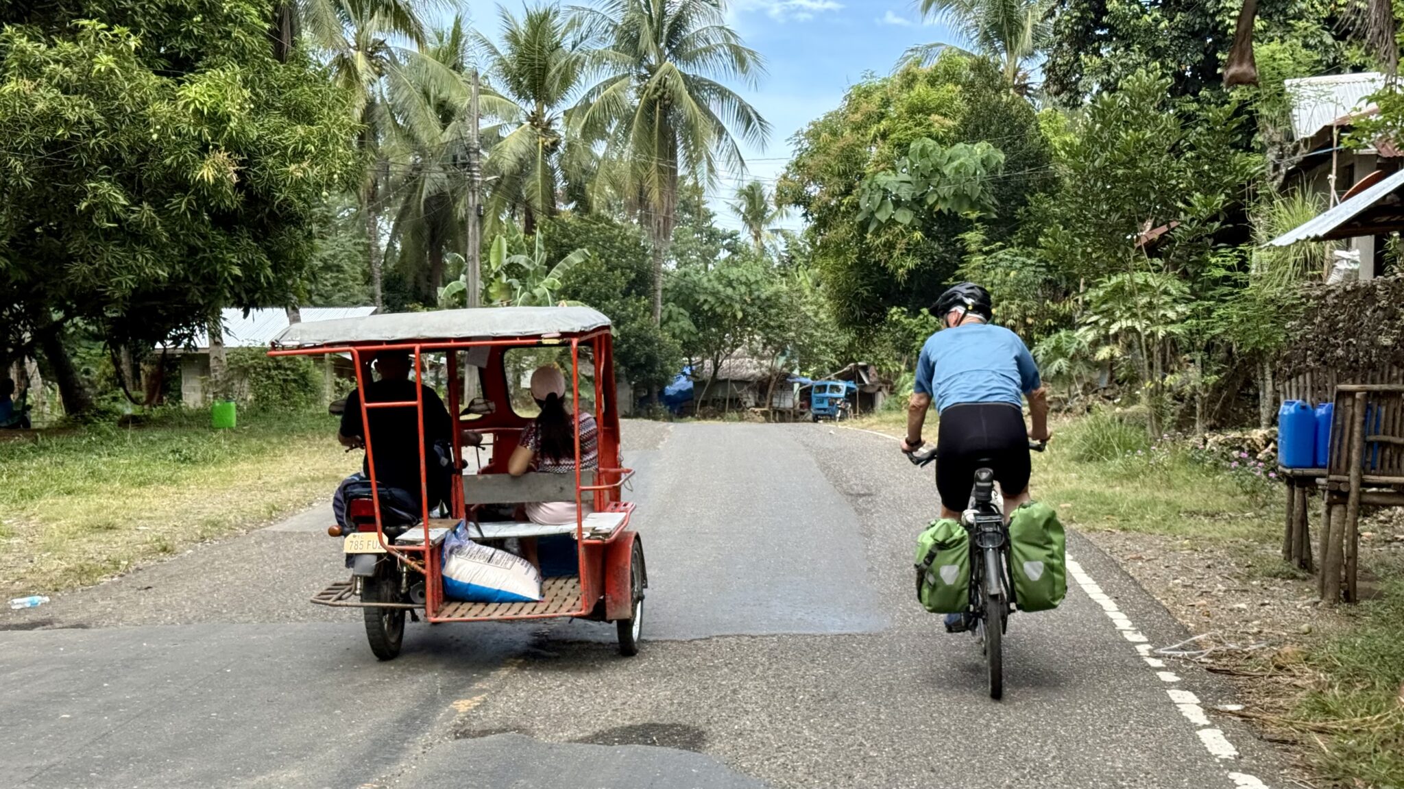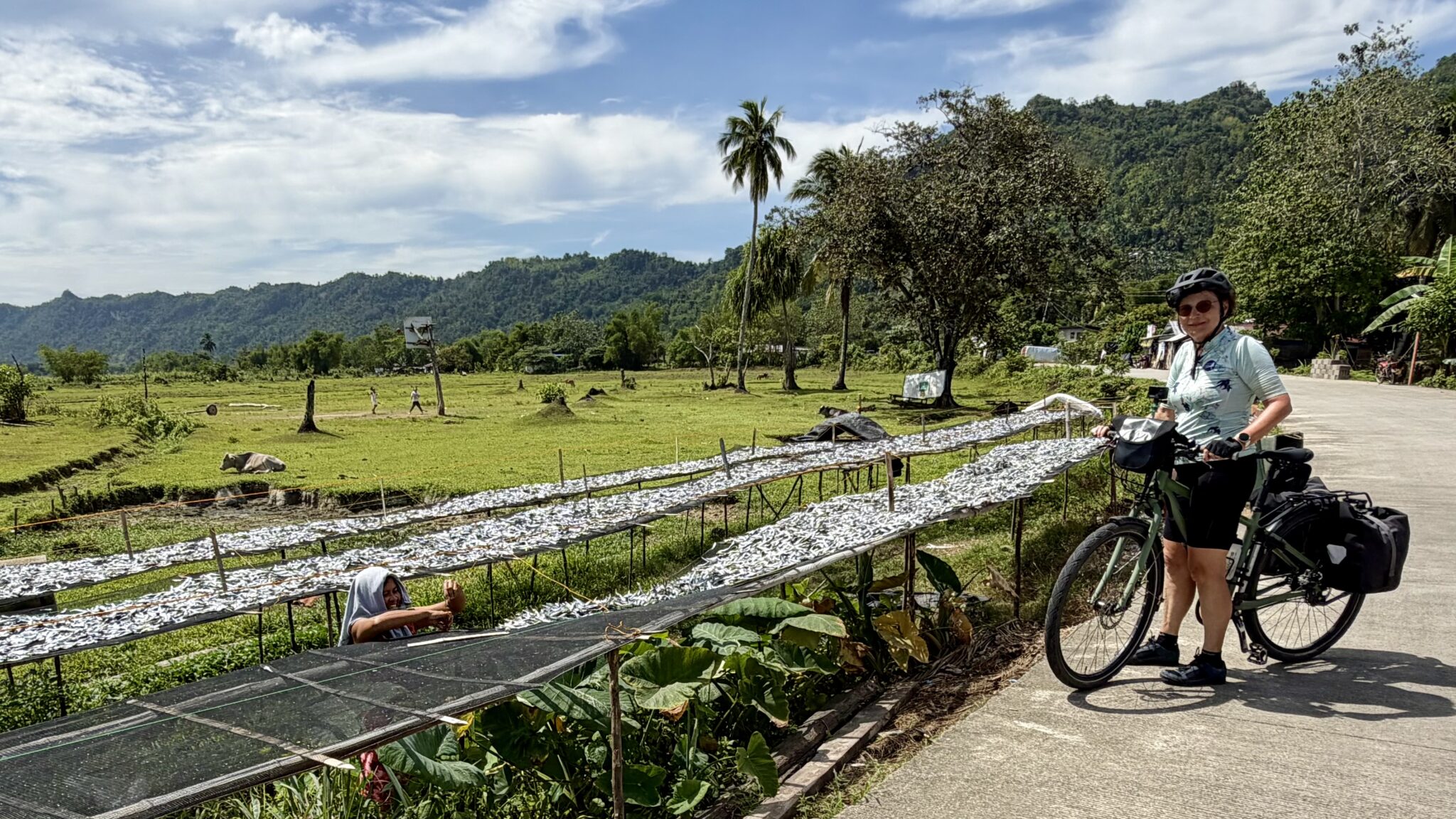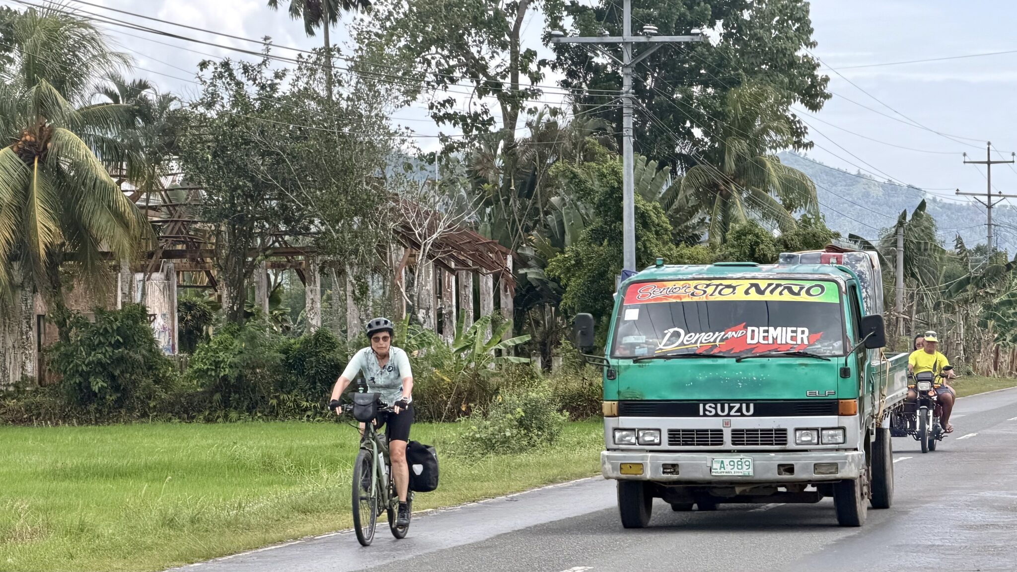 Vanaf hier rijden we redelijk vlak met de wind vol op kop verder. Het fietst soepel en het is een traject om blij van te worden. We passeren kleine dorpjes. We rijden langs rijstterrassen omzoomd door palmbomen. Het wegdek is goed genoeg en het verkeer valt mee.
