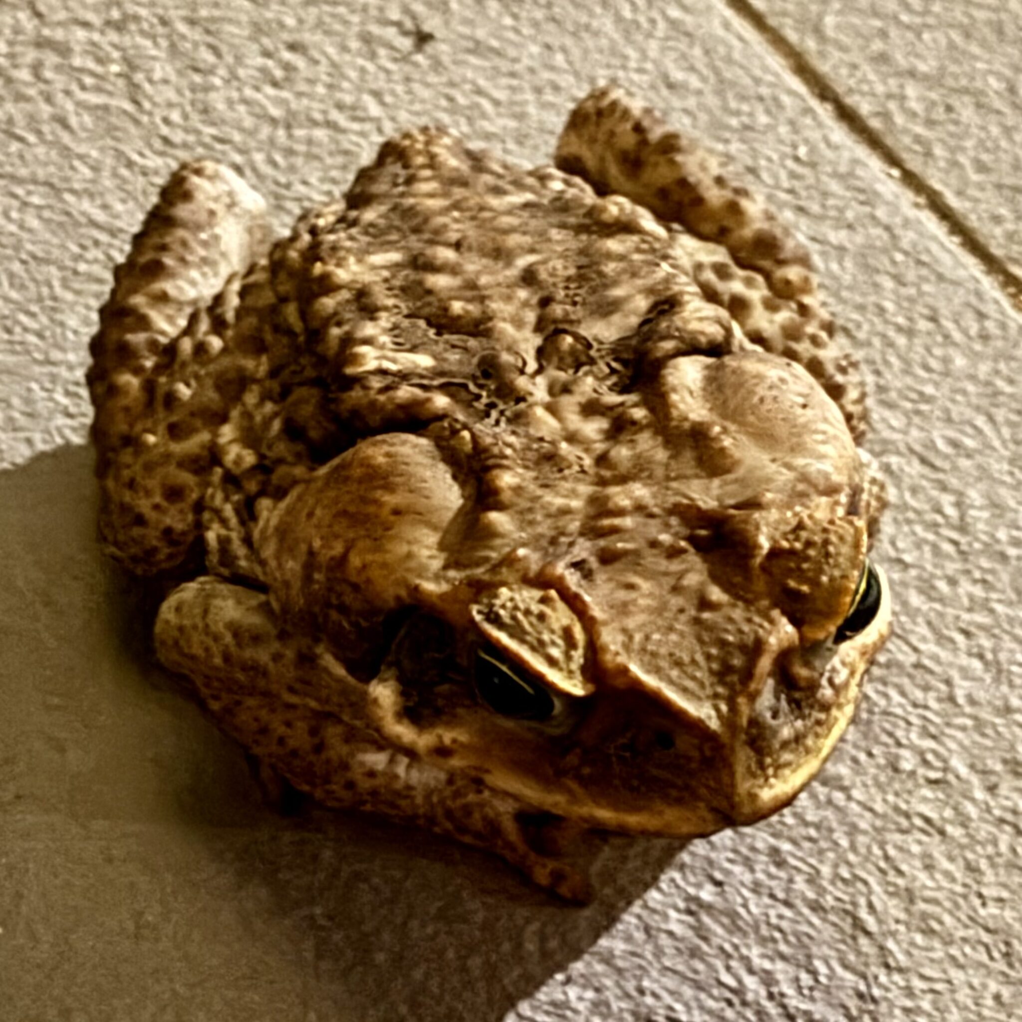 Het terras delen we met een pad, zo ongeveer schoenmaatje 38.