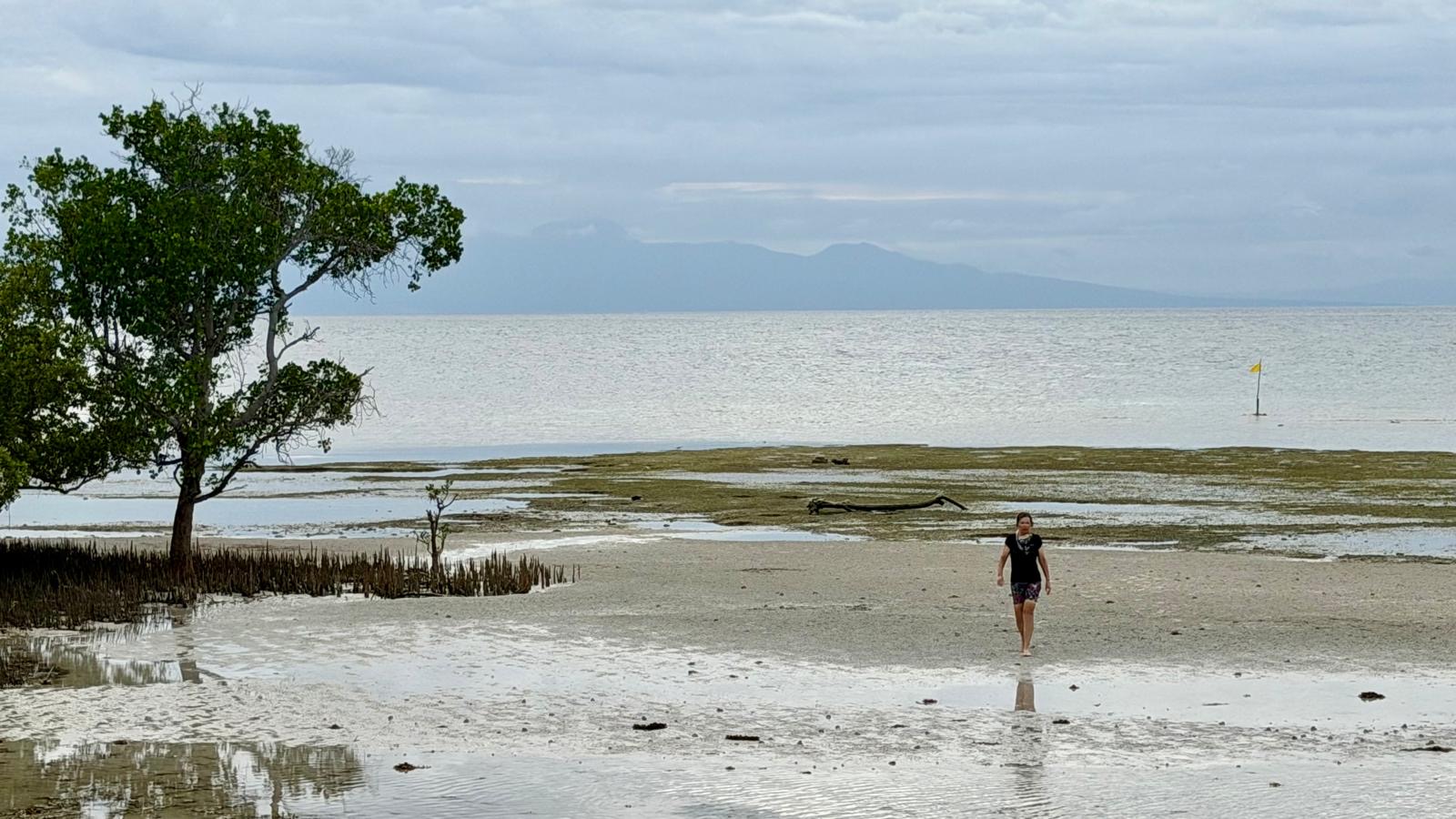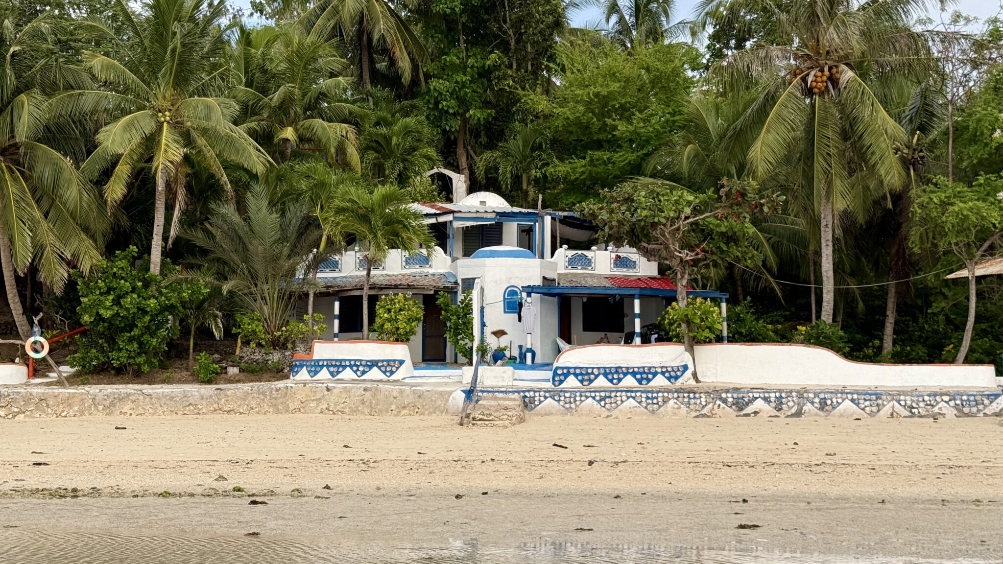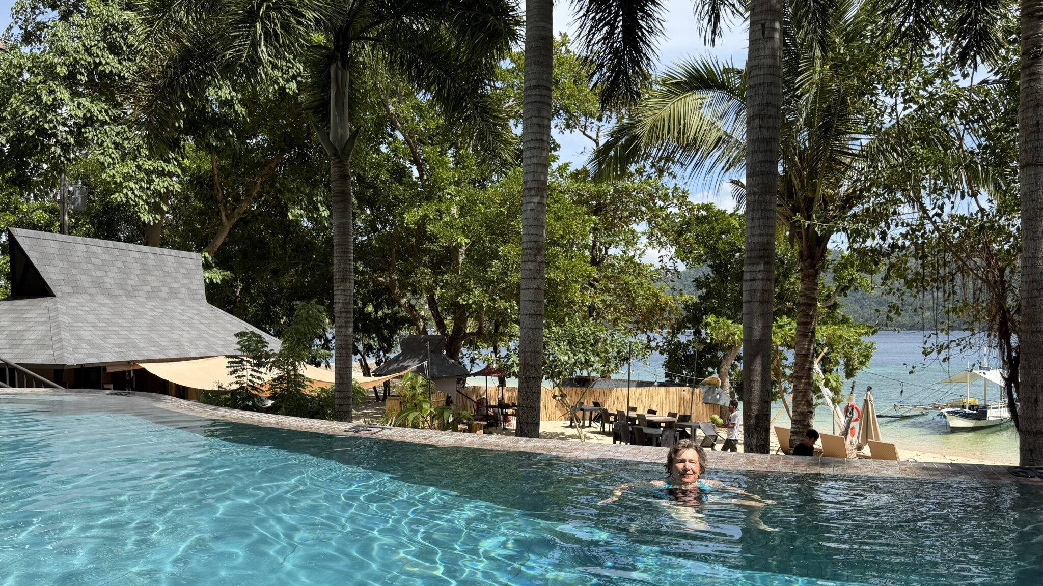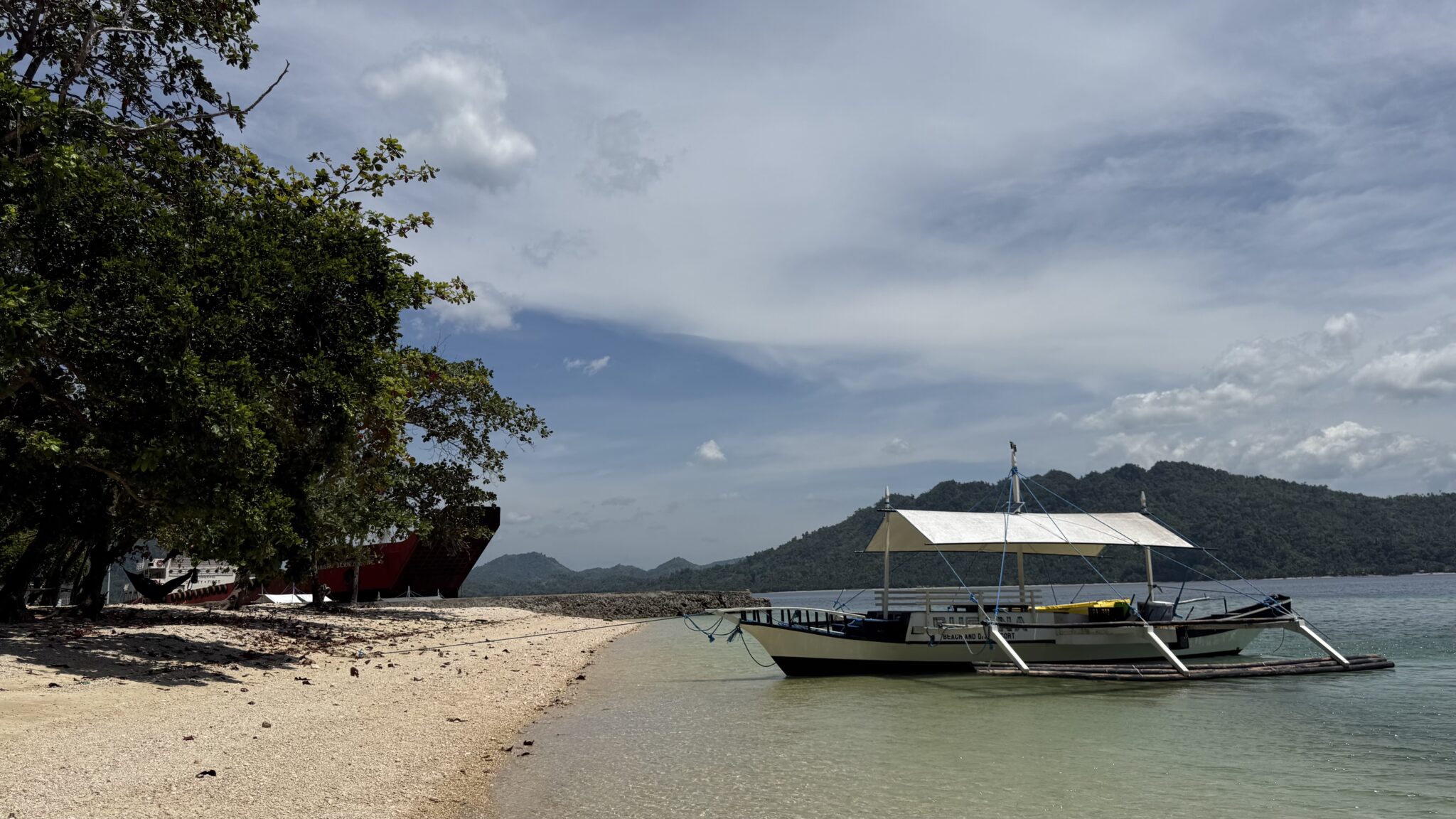 In de baai ligt een groot roestig schip. Wat verderop hangt een touw. Daar duiken we onderdoor naar de ingang van het resort. Bij de balie staan vijf mensen om ons te ontvangen. Iedereen heeft een eigen klusje. Maar als we willen betalen weigert het pinapparaat.