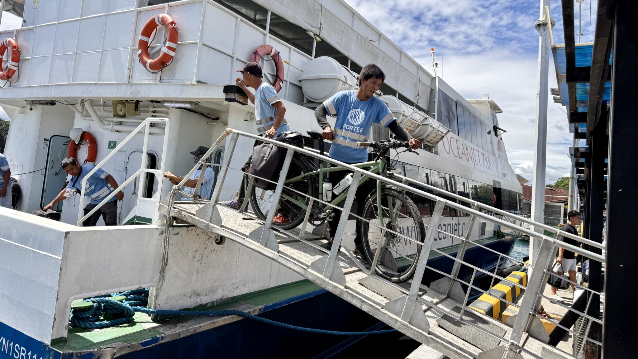 Gisteren hebben we tickets voor de ferry naar Negros al gekocht. Dat betekent dat we het haventerrein op mogen. Nu moeten we nog in de rij voor de havengelden, om de fiets te wegen en om voor de fiets te betalen. En voor een bagagescan. Net als we willen doorlopen voor koffie blijkt dat we ook een QRcode ergens voor moeten hebben. Nog een keer in de rij dus. Terwijl we wachten op de boot raken we aan de praat met de Amerikanen naast ons. Ze zijn de koude winter van Chicago ontvlucht naar Griekenland en Ethiopië. Nu zijn ze hier, met hun 79 jaar, om te wandelen. Een mooie inspiratie.