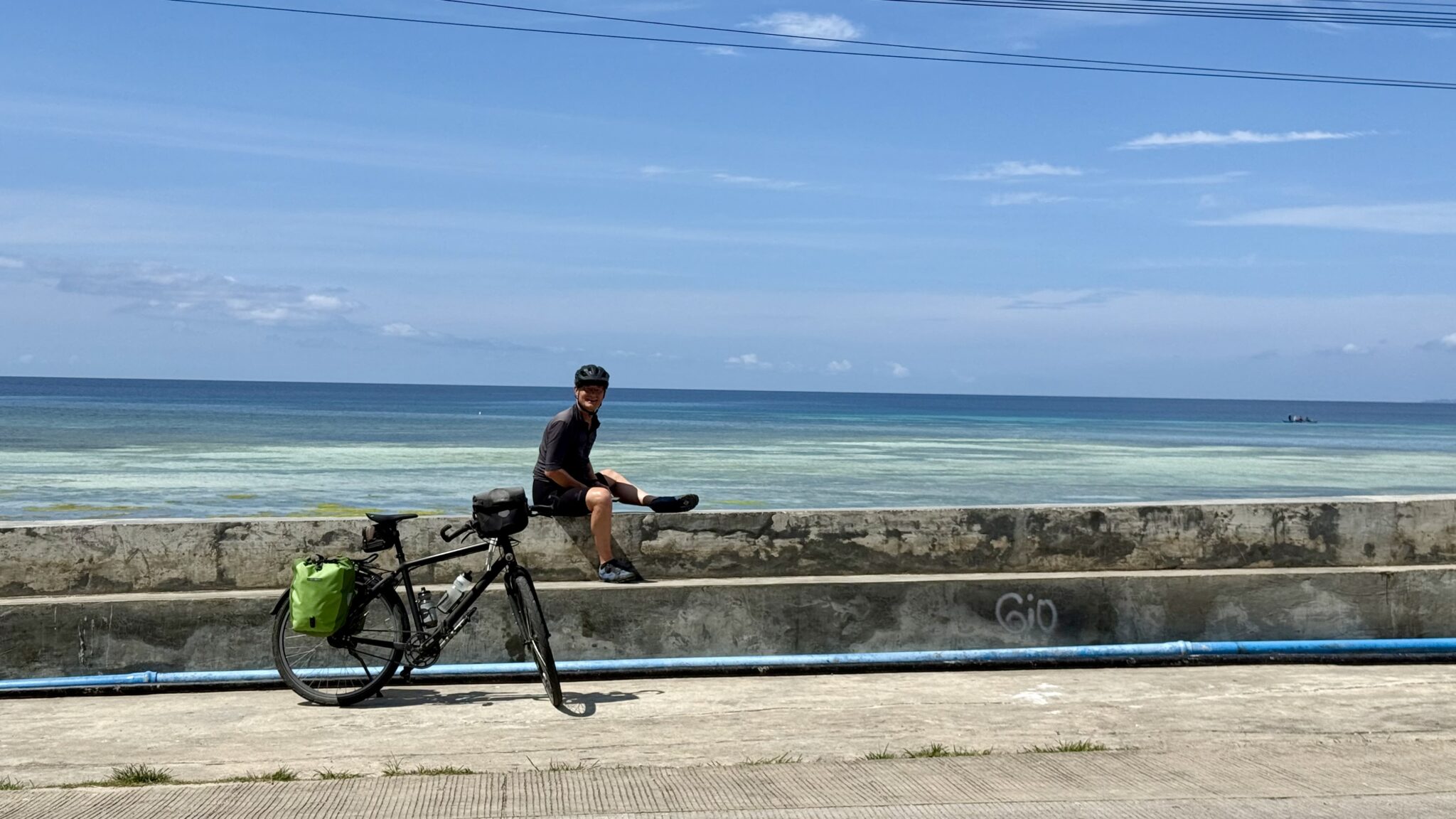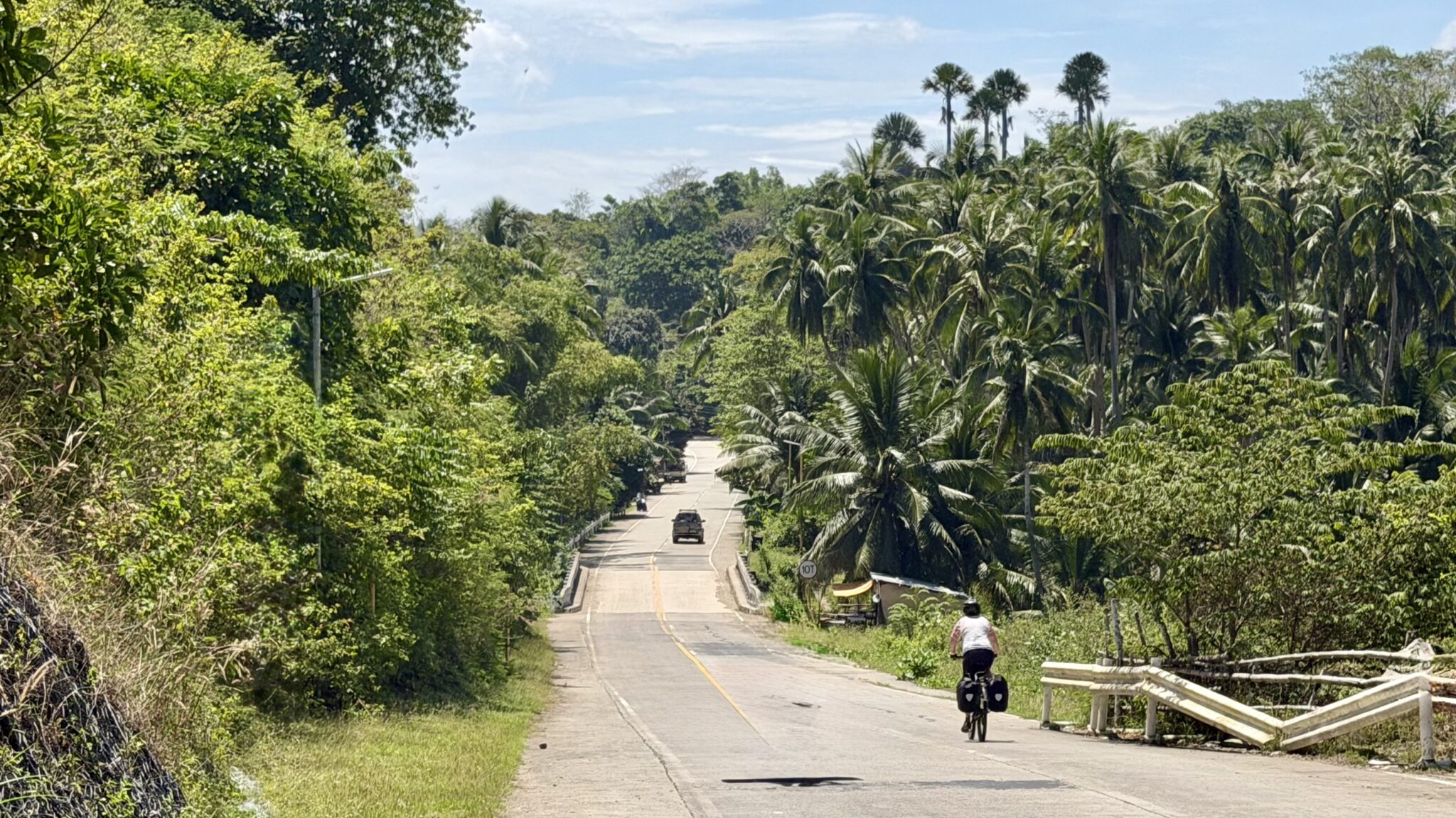 Als steeds is de weg rustig en groen en fijn. Het is lekker om weer onderweg te zijn. Veel kokospalmen en bananen. We rijden vlak langs de zee.
