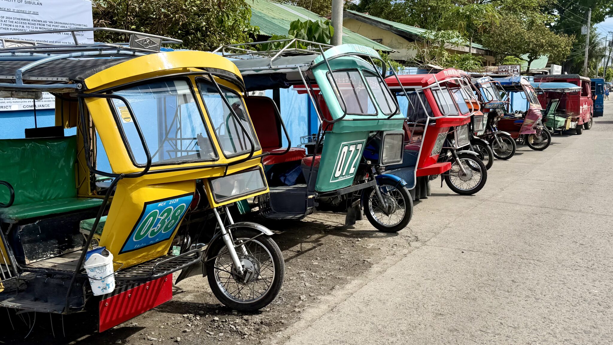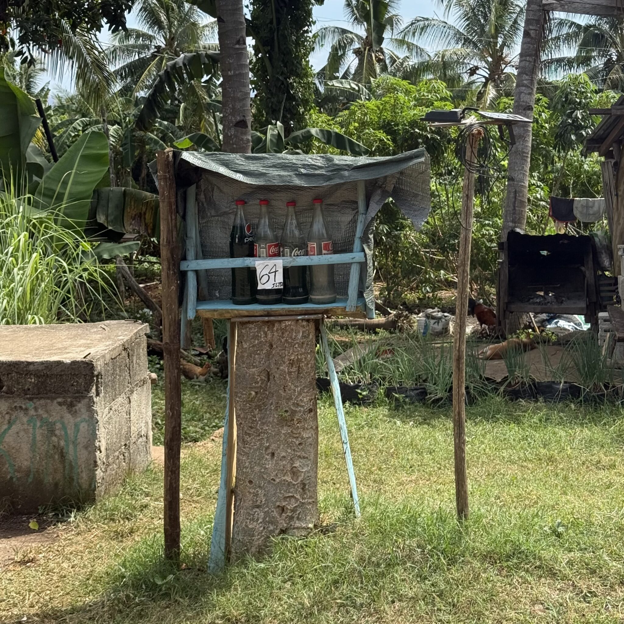 Het grootste deel van de route gaat over de circumferential road, de rondweg rond het eiland. Een klein stukje gaan we eraf. Hier wordt meteen duidelijk welk gehucht slechte relaties heeft (of onvoldoende belasting betaalt) daar is de weg beroerd. En voor de brommerrijders wordt de benzine hier per liter verkocht.
