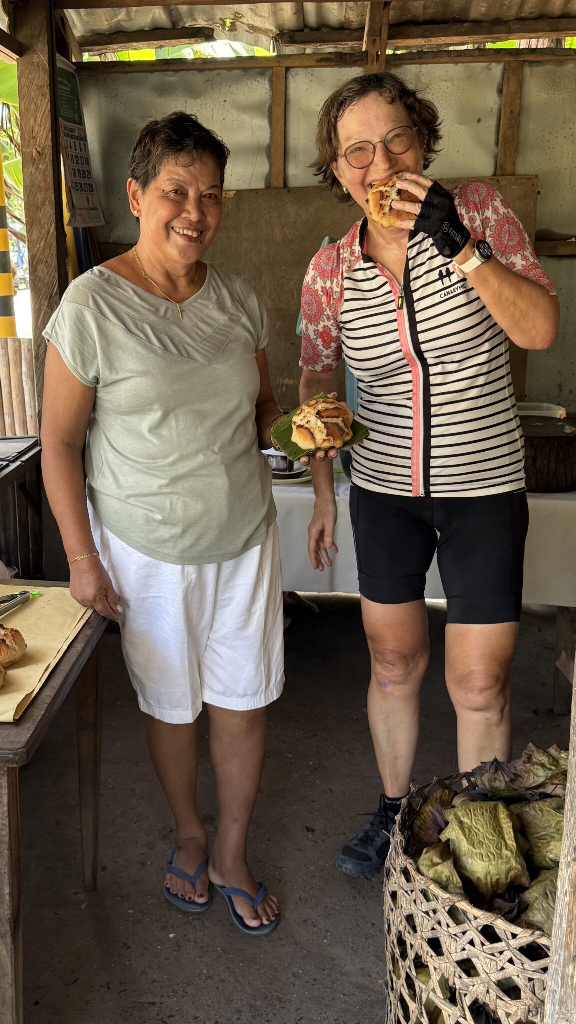 We stoppen bij een winkeltje. De dame haalt vers gebakken bibingka uit bakvormen met bananenblad. Dat willen we wel proeven. Het is een heerlijk zoet broodje op basis van rijstmeel en verse kokosmelk. Beslist een aanrader om thuis te proberen. En natuurlijk gaan we samen op de foto.
